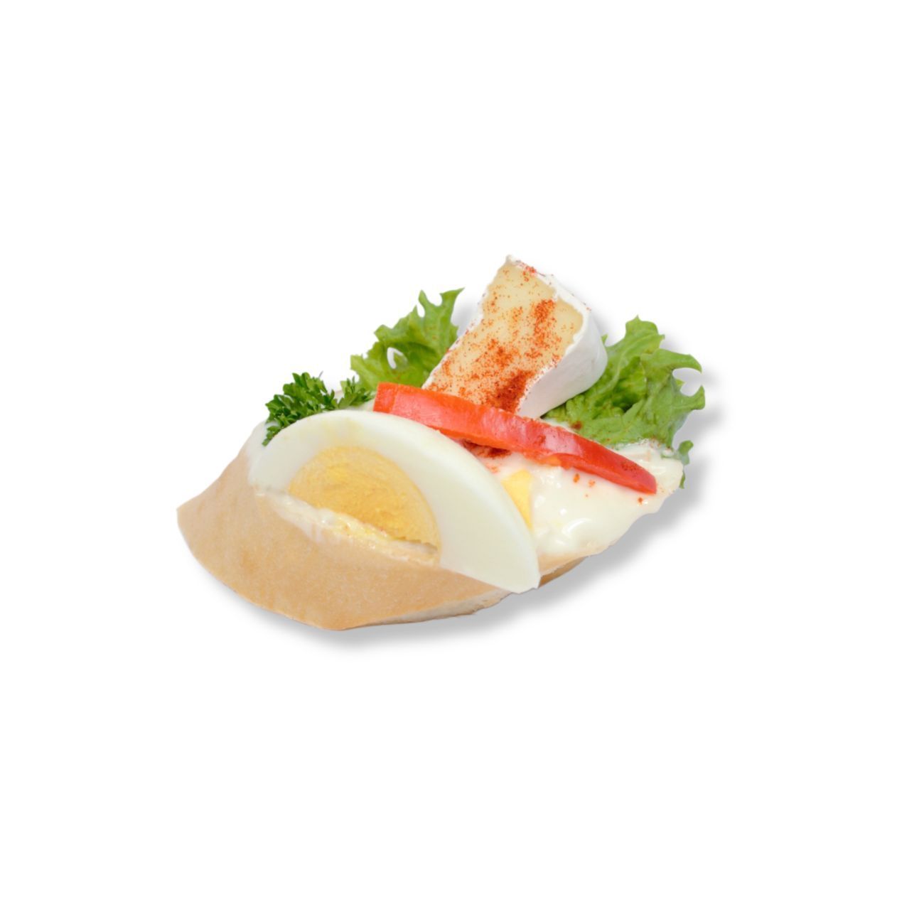 Hermelín, hermelínová pomazánka, vejce vařené, světlá bageta, majonéza, kapie sterilovaná, petržel, mletá paprika