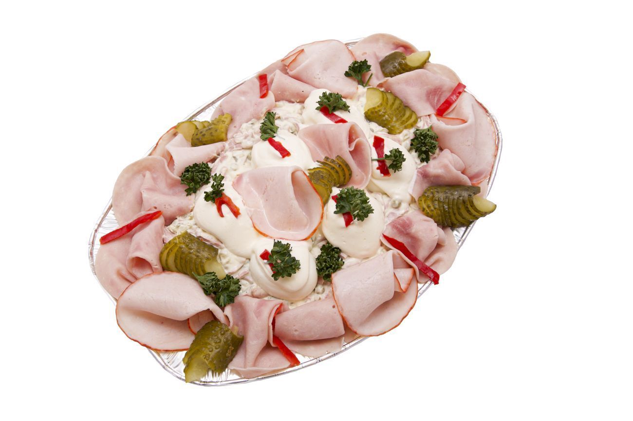 pochoutkový salát, vařená vejce, majonézový přeliv, šunka, debrenínka, okurka a kapie, petržel