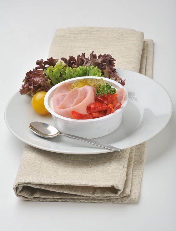 Bramborový salát, šunka, vejce vařené, majonézový přeliv, okurka, kapie, petržel